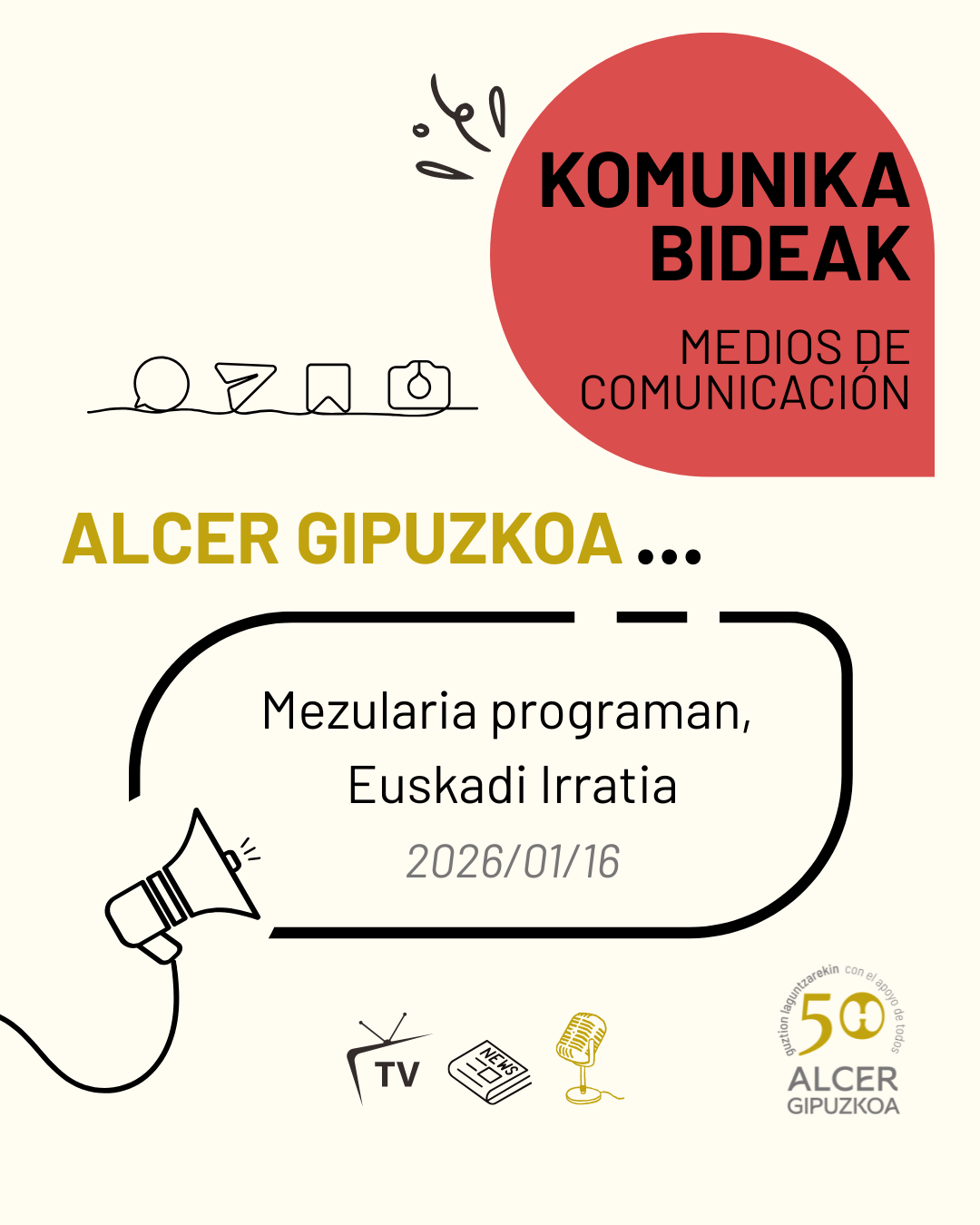 El 16 de enero, la presidenta de Alcer Gipuzkoa, Arantxa Lazkano fue entrevistada en Euskadi Irratia en el programa Mezularia. Arantxa lleva media vida con un trasplante renal, y, valora la donación como un acto de mucha generosidad, y muy necesaria. Arantxa ha formado parte de Alcer desde hace más de 35 años como voluntaria